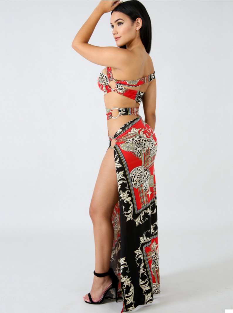 Printed gown with strappy details, single off-the-shoulder strap, ring accents, side slit, and cut-outs. Other accessories not included.
