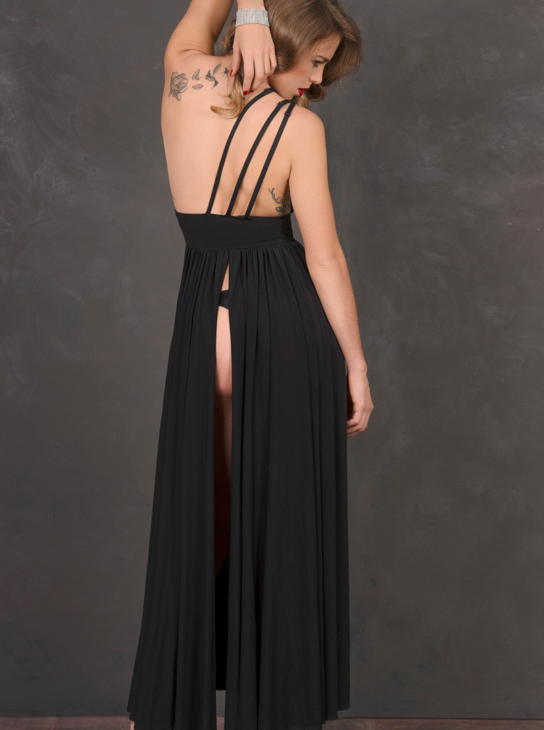 Revealing gown with back slit, front slits, single shoulder, and triple adjustable straps. Model is wearing a panty- not included. Other accessories not included. Made in France. Please allow 1-2 weeks for delivery.