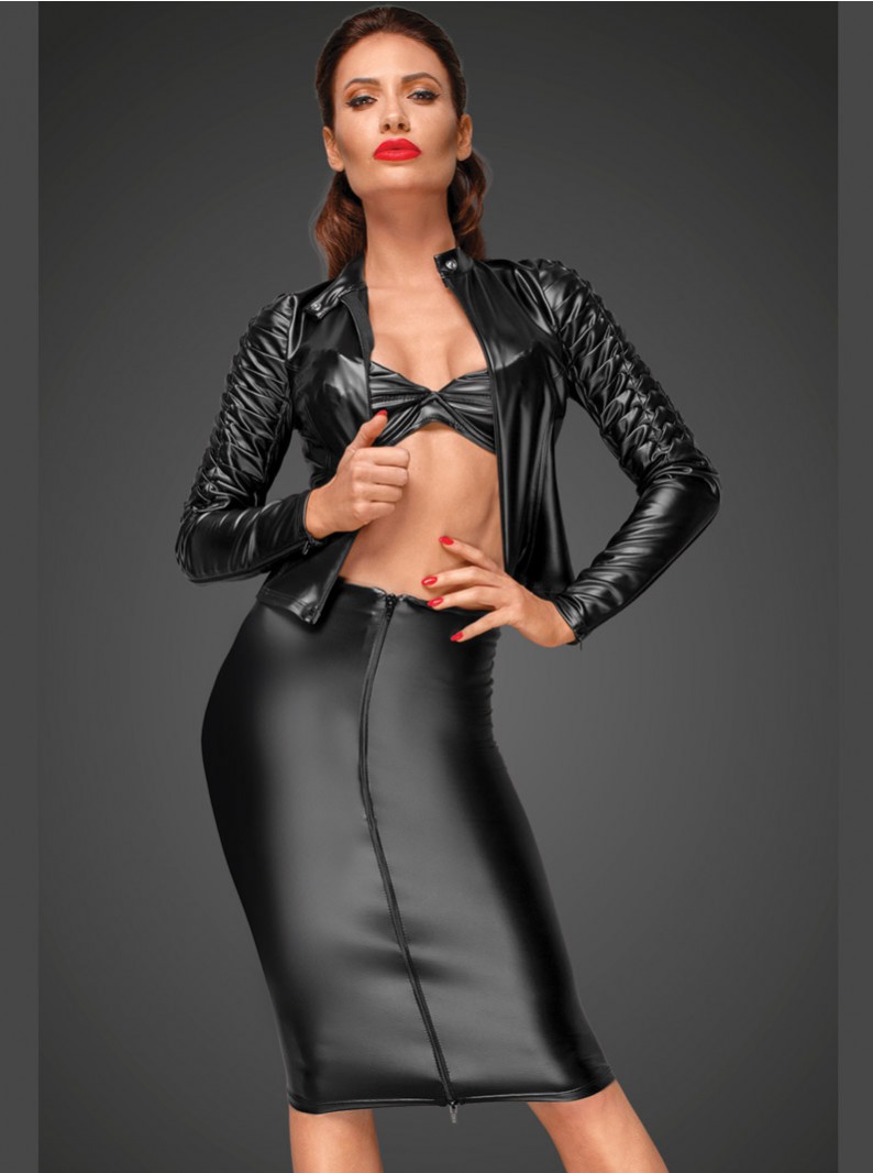 Power wet-look pencil skirt with two-way zipper front and pleated back. Model is wearing a bra and jacket- not included. Imported from Europe. Fetish-inspired. Other accessories not included. Please allow 1-2 weeks for delivery.