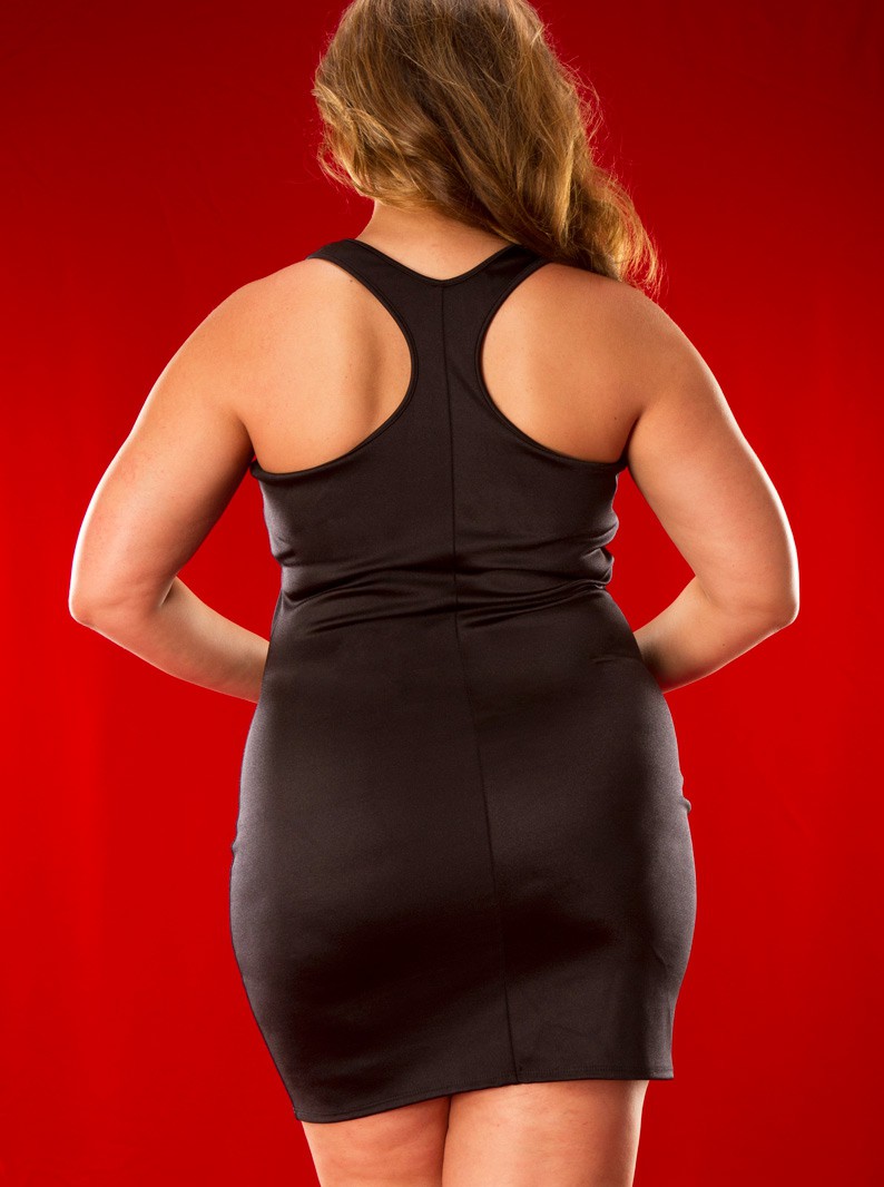 Classic racerback mini dress with a new twist. - Built-in bust support. - Scooped neck. - Thick shoulder straps. - Racerback. - Stretch Lycra. - Made in the U.S.